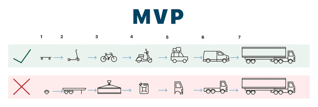 - 我们的目标是制造一个载具,所以在迭代的过程中每个版本都要交付能载人的工具,而不是每个版本都制造一个零件,等到最后再拼起来。