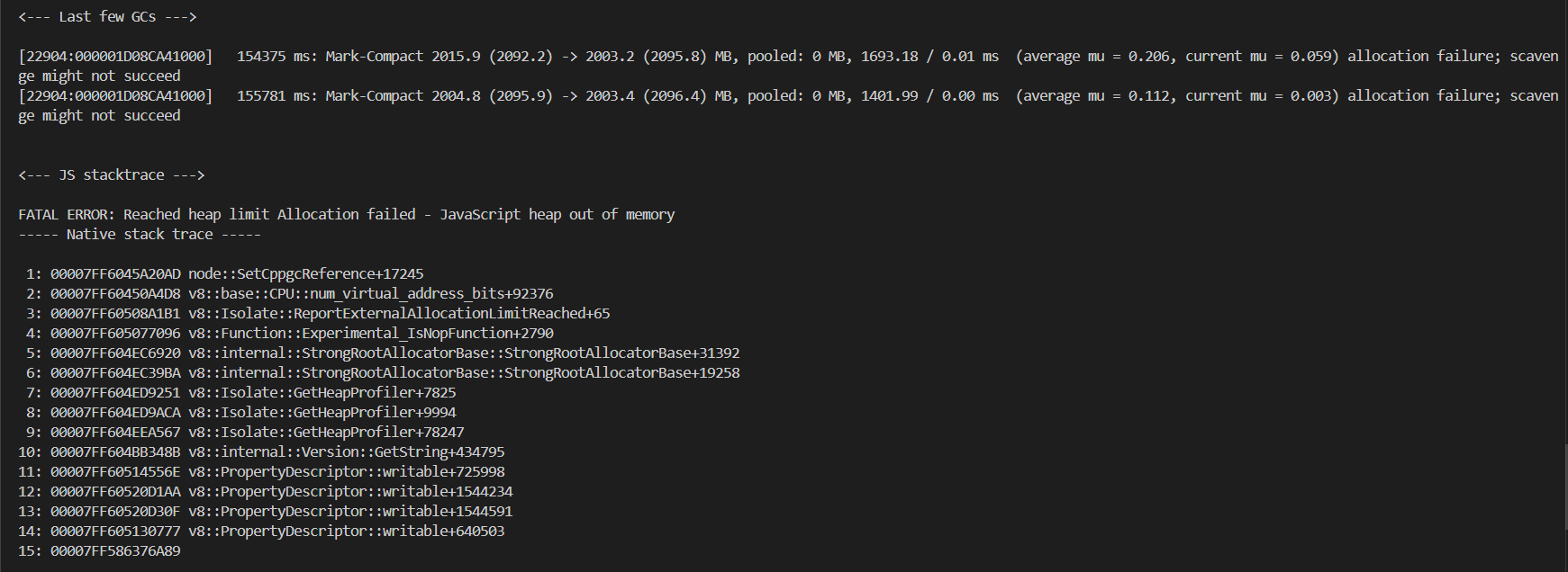 Node.js 在运行过程中遇到了内存不足的问题,导致 JavaScript 堆内存超出了限制 (JavaScript heap out of memory)。