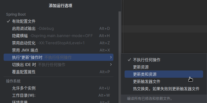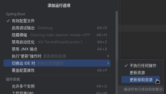 - 将 “执行更新操作时” 和 “切换出IDE时” 的选项都修改为 “更新类和资源”。